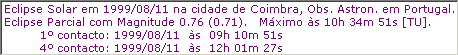 No que diz respeito aos Eclipses Solares, e visto estes serem de maior importância (pelo menos a nível civil) aparece a data de ocorrência do eclipse, o tipo de eclipse, a sua magnitude, a hora a que o mesmo é máximo e ainda os diferente contactos. Na figura seguinte aparece o texto que deverá surgir quando o utilizador escolher o ano de “1999” e o local “Coimbra, Obs. Ast.”